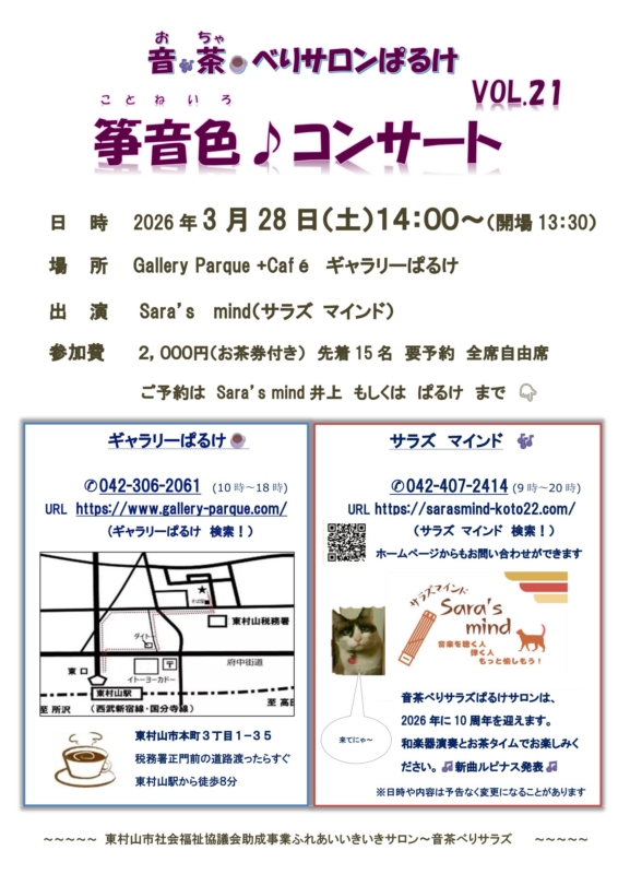 ぱるけサロンコンサートは、今年10周年を迎えます。このコンサートは、「東村山市社協いきいきふれあいサロン」事業として活動しているものです。2016年冬に計画、4月にファーストコンサートを開催。10年ひと昔でいろいろと内容も変化しましたが、変わらずのオーナー様のご理解と、聴いて下さる皆様のおかげです。特にずっと参加していただいているリピーター(会員)の皆さまには感謝の気持ちでいっぱいです。
